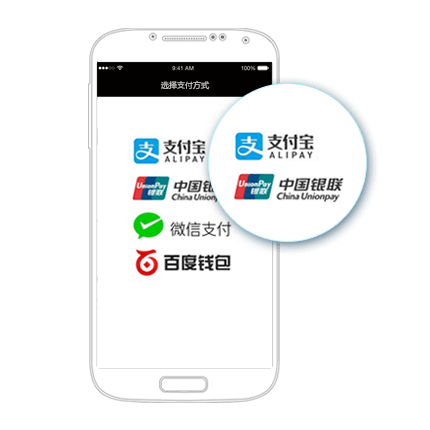 聚合支付平台,为iOS/Android原生/H5 App提供支付解决方案:支持微信支付、支付宝支付、银联手机支付、百度钱包等。